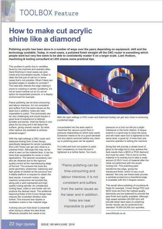 The acrylic GEN2 (Generation2) range of tools are a relatively new alternative to achieve polished results in clear acrylic. Available in 3mm, 4mm and 6mm diameters, they are ideal for applications such as a smaller production run or where the slightly higher degree of polished edge from a diamond polishing tool is not warranted. These carbide tools are ground specifically to provide the best edge possible in clear acrylic. Additional grinding time during the manufacturing process and specific cutting angles on the helix of the tool, produce a polished edge in a single cut and without the need for a secondary clean up pass. The GEN2 tool can also be used in other clear materials such as polycarbonates, a material very difficult to normally produce a polished edge on.
